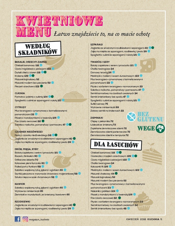 Redakcja krytycznie odniesie się do diet – zarówno tych będących na czasie, jak i tych służących poprawie zdrowia. Do tej pory prezentowane były potrawy oparte na sezonowych produktach, ze sprawdzonych źródeł. Teraz redakcja będzie proponować również dania uwzględniające ograniczenia, jakimi podlega coraz większa liczba osób. W kwietniowym wydaniu będzie to dieta bez glutenu - na 18 stronach czytelnicy znajdą najważniejsze informacje i przepisy na dania bezglutenowe.